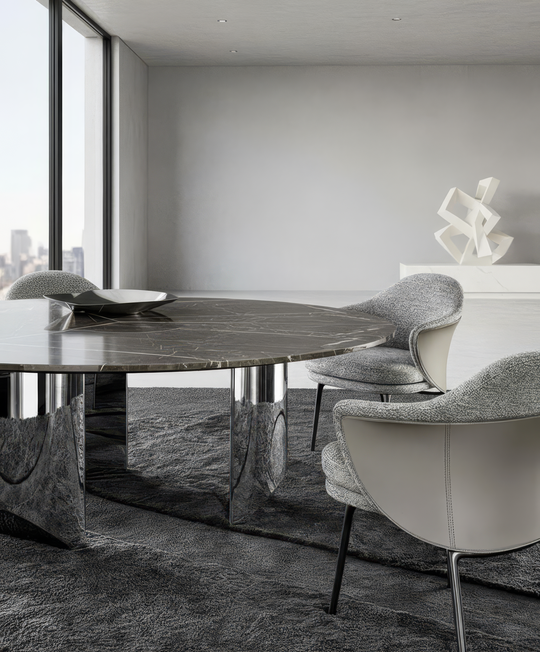A masterful interplay of mass and lightness, the Bellamy 8-Seater Marble Dining Table redefines balance through bold, sculptural volumes and subtle visual illusion. With semi-circular legs tapering into angled chisel-like tips, the table appears to float—a dynamic tension between weight and air.