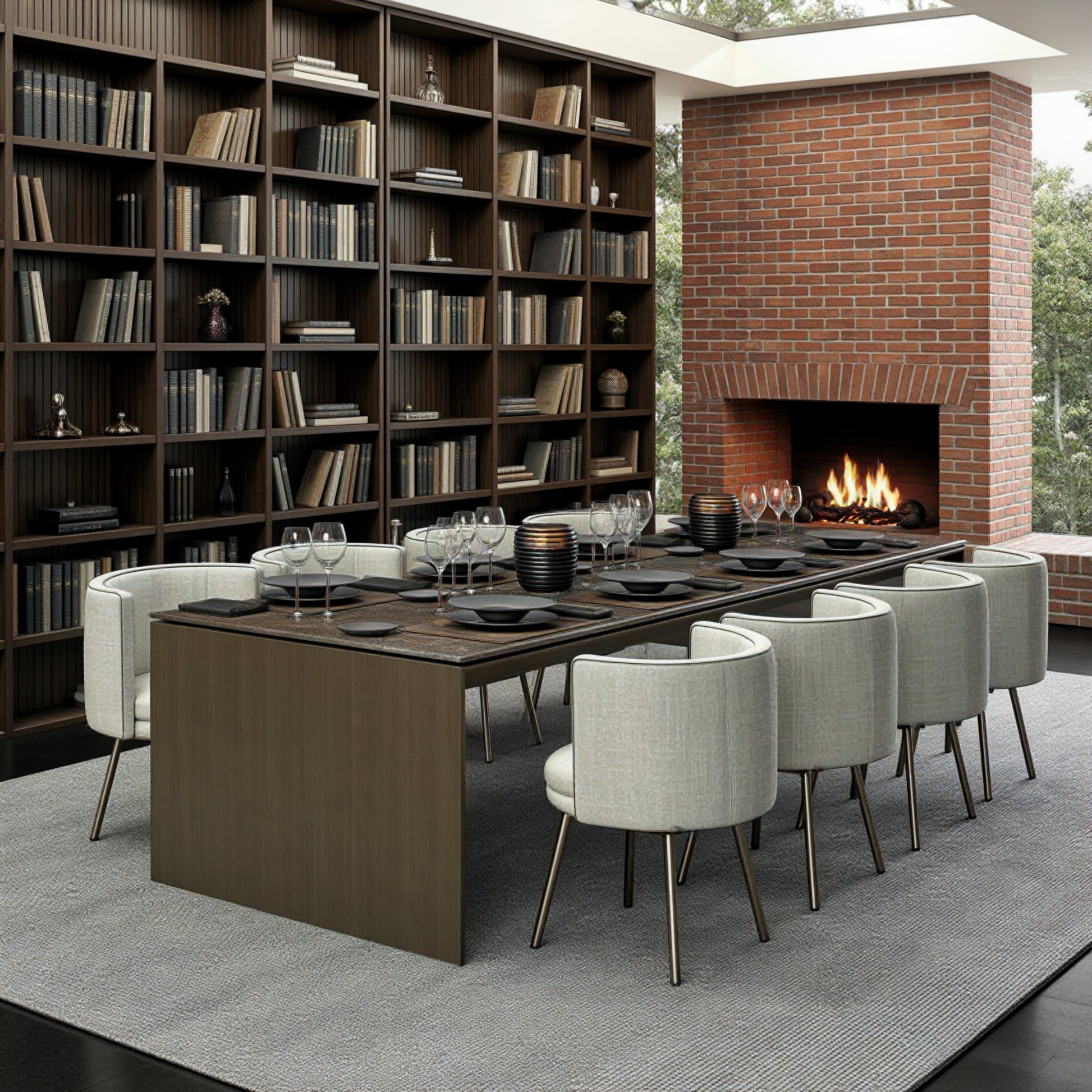 A study in proportion and refined detail, the Bomber 12-Seater Wooden Dining Table reflects the architect’s minimalist vision and dedication to elegant engineering. This achieves remarkable lightness and visual purity—allowing rich, sculptural materials like marble and wood to speak with quiet power.