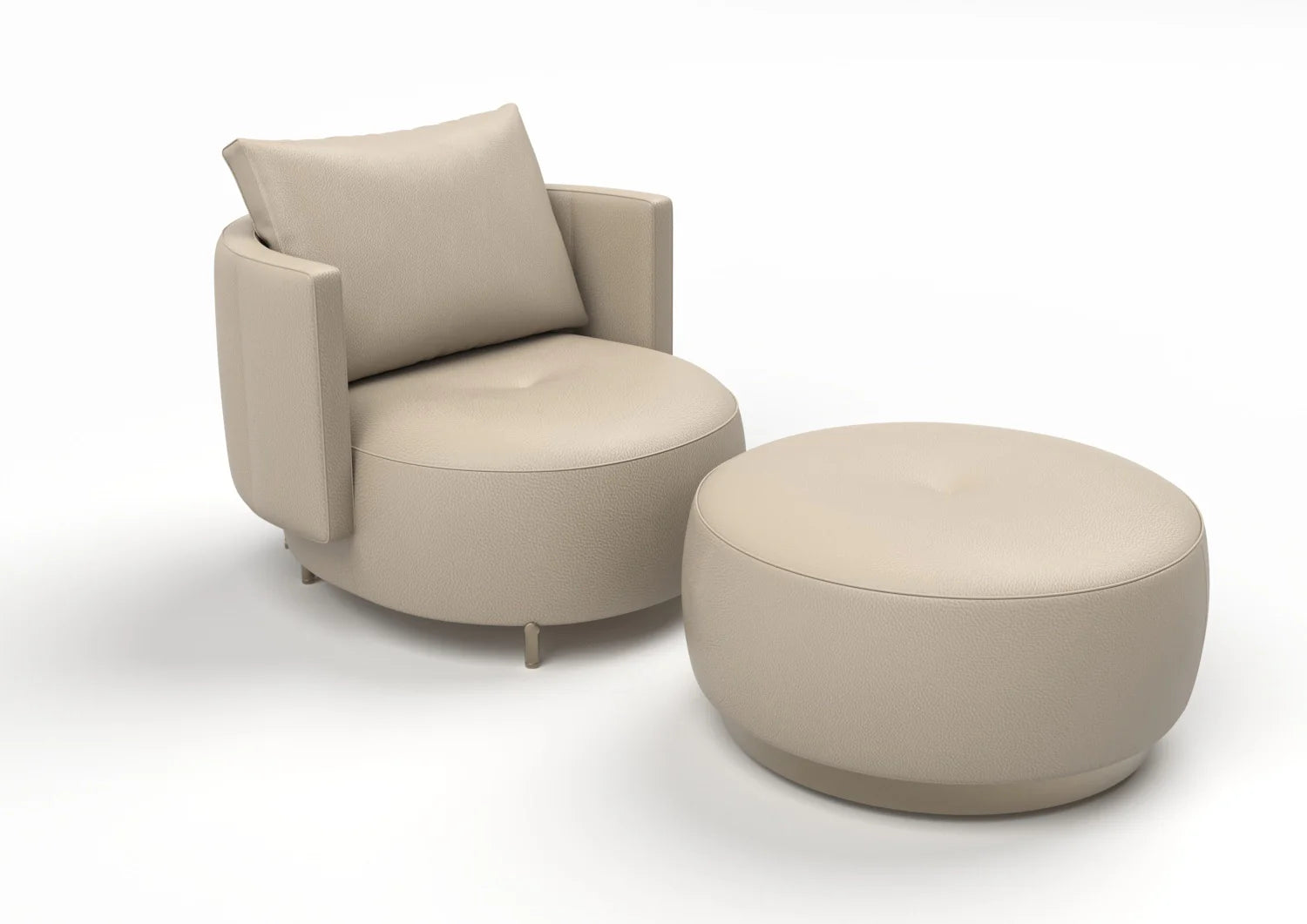 Grounded in sculptural symmetry and refined volume, the Menatti Leather Armchair & Ottoman Set reflects a thoughtful contrast between soft, expansive upholstery and the precision of a minimal base. Its curved silhouette and defined piping echo artisanal tailoring, while the vertical quilting across the backrest reveals a quiet sense of architectural rhythm. Designed with removable elements for ease of maintenance and flexibility, every structural component is crafted to support both comfort and longevity. A concealed swivel mechanism delivers subtle movement without disrupting the armchair’s clean profile.