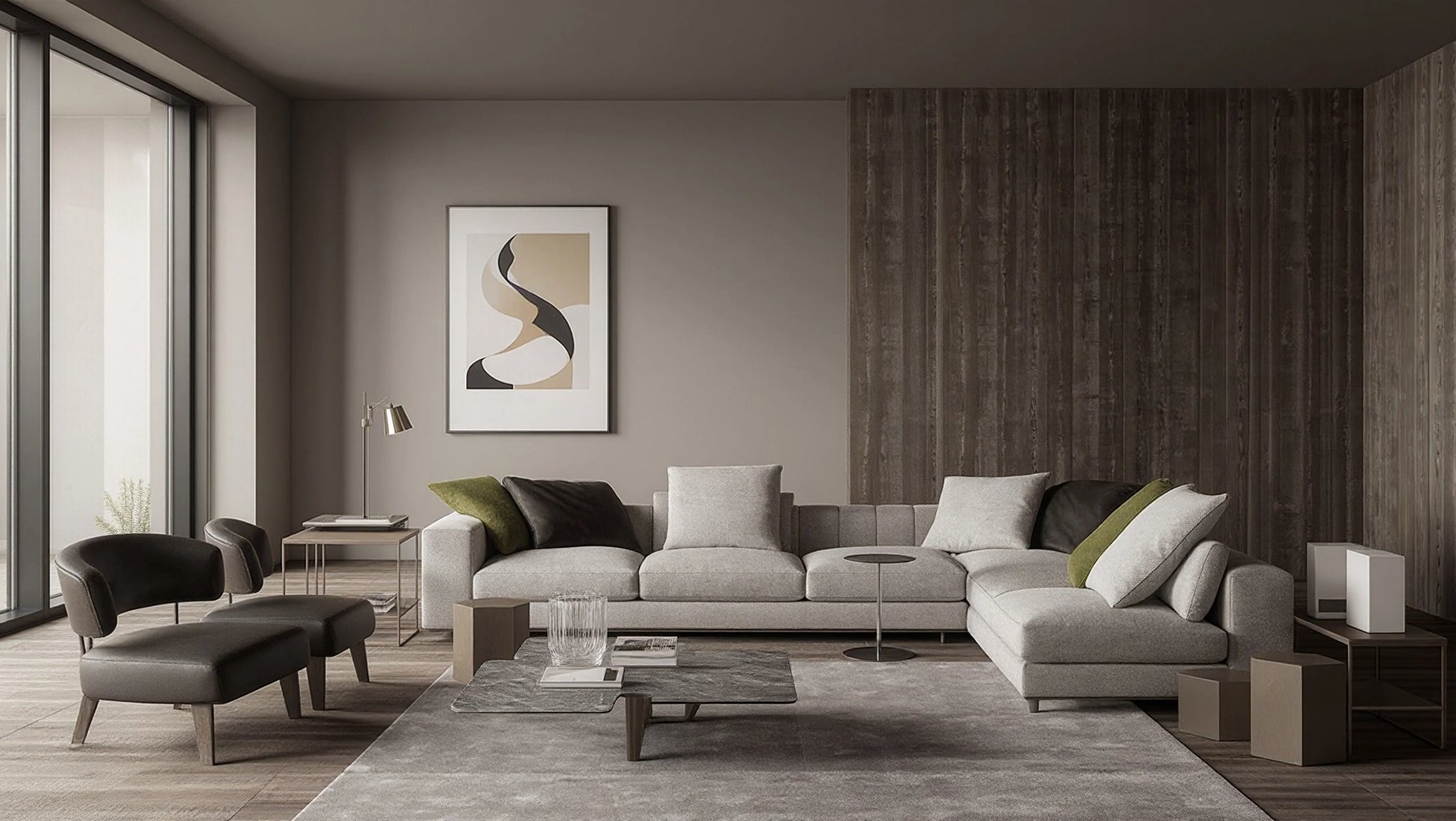 • Upholstered in plush fabric, tailored to each element’s function and form