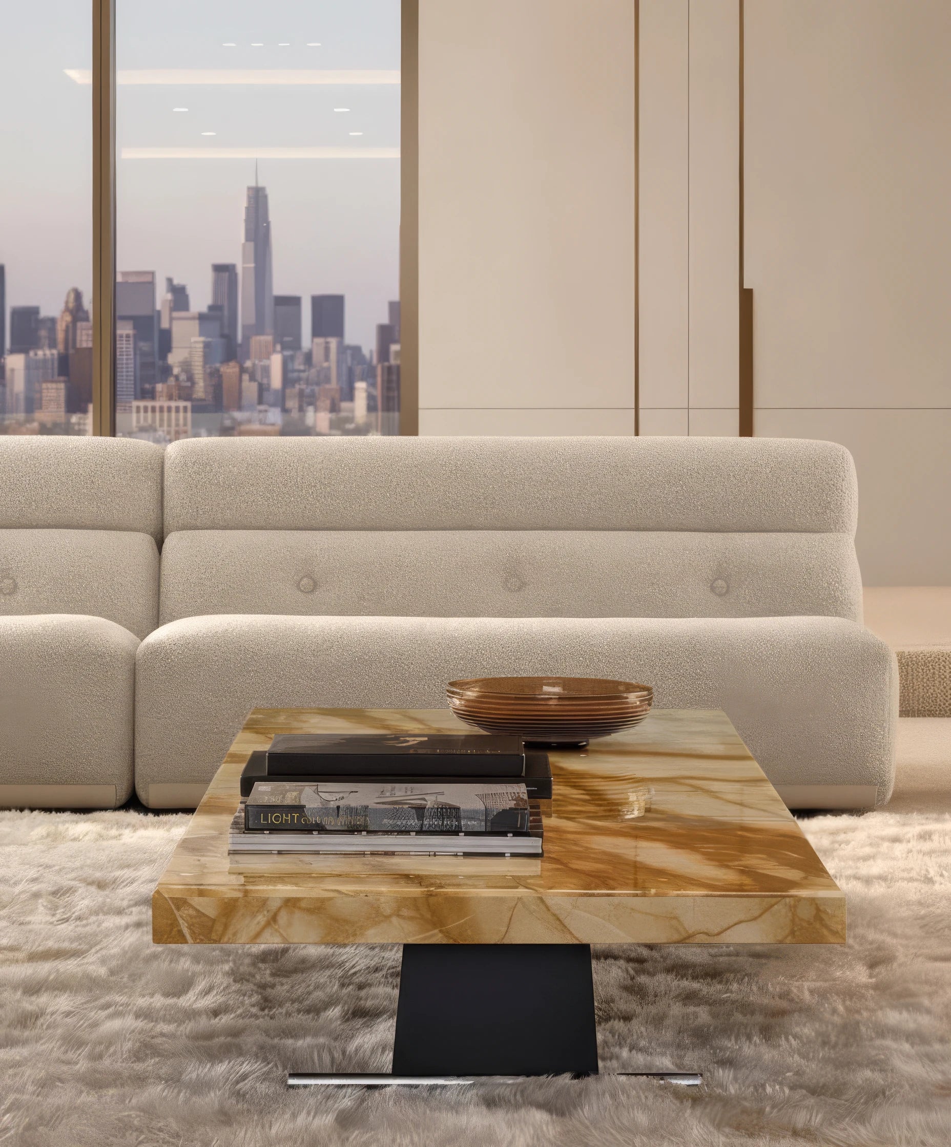 Yaser Marble Coffee Table is defined by a striking architectural design that balances sculptural form with refined elegance. Its top features an inverted profile accentuated by a recessed metal detail, lending both depth and sophistication to the piece. The base, composed of sleek polished elements, supports the top with an appearance of weightless suspension. Carefully crafted to combine strength with lightness, it becomes a refined focal point that enhances contemporary interiors.